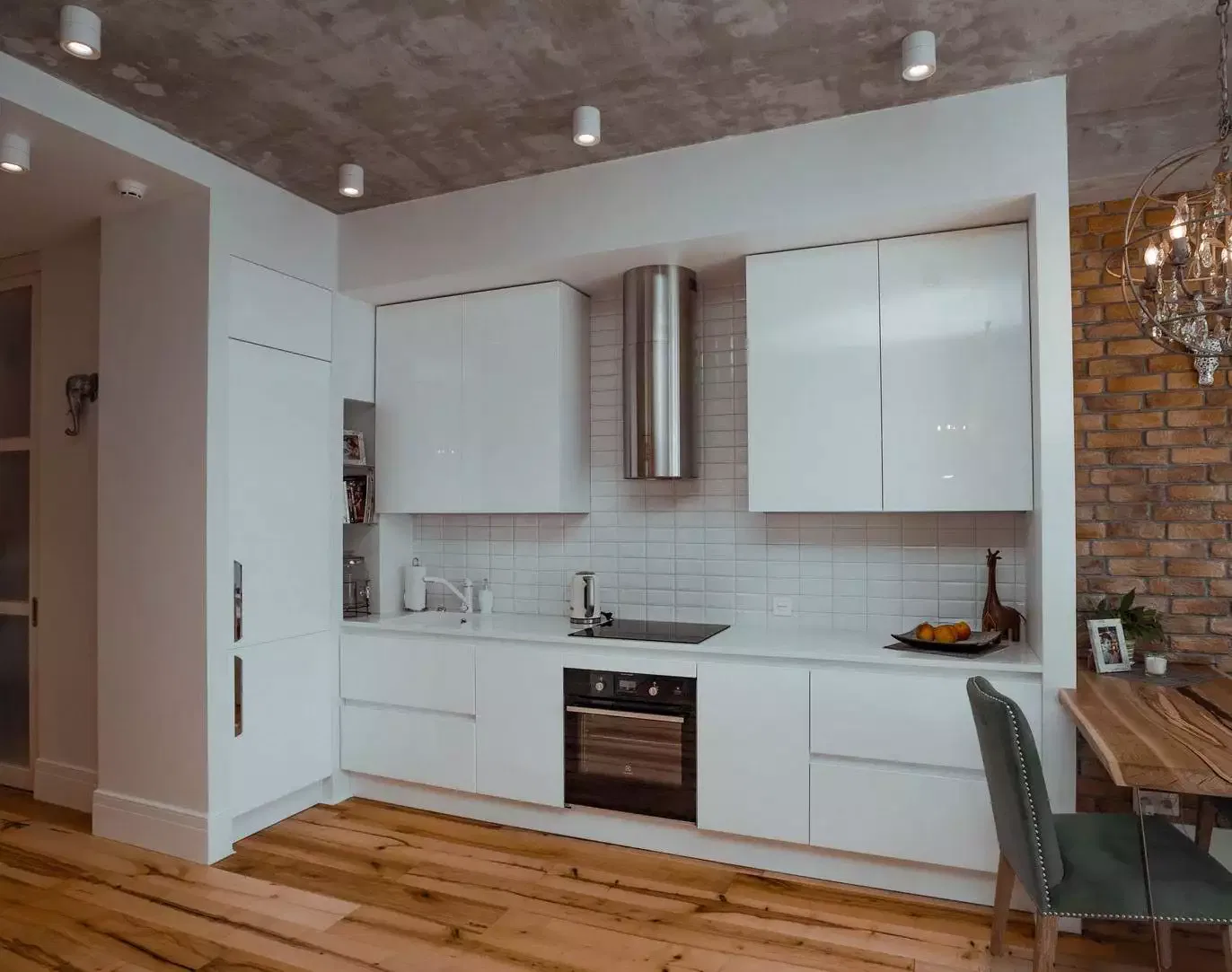 The kitchen became brighter, warmer, and cozier. The tiles were 4 by 8 inches, and at the customer’s request, we did not apply the 50% offset. The tiles were arranged symmetrically. The whole design matched the style of the furniture perfectly. It made the kitchen look fresh and interesting.